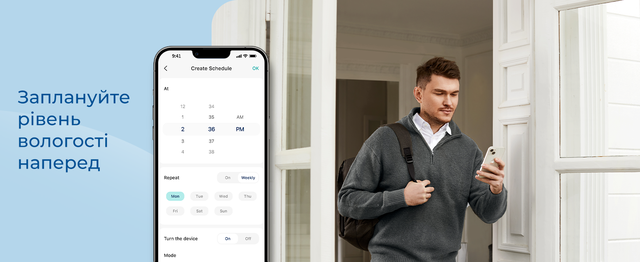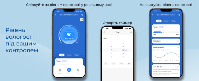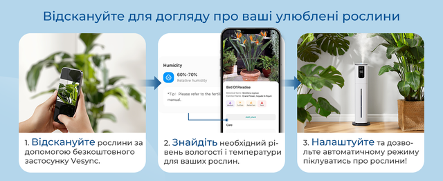 Керуйте налаштуваннями, створюйте графіки, переглядайте рівень вологості в реальному часі та багато іншого за допомогою безкоштовного додатку VeSync.