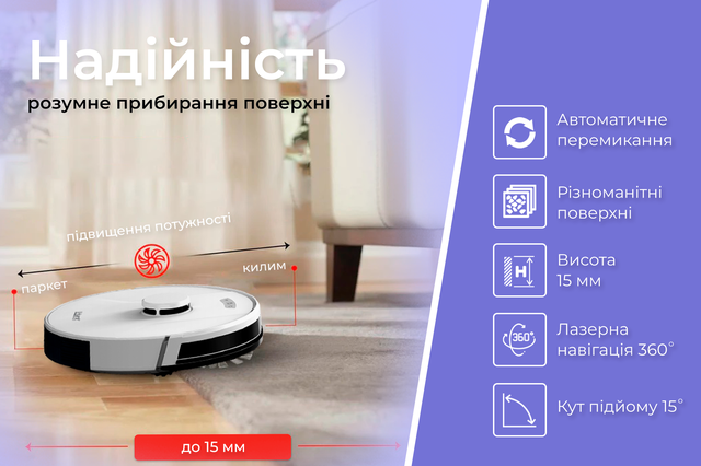 Робот-пилосос має інтелектуальну здатність автоматично виявляти зміни типів поверхонь та адаптуватися до них. Він самостійно розпізнає різні види підлог і килимів, та вибирає найоптимальніший режим роботи, що гарантує ефективне та високоякісне прибирання для кожної конкретної поверхні. Це дозволяє досягти найкращих результатів прибирання, не потребуючи вашої додаткової участі.